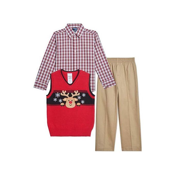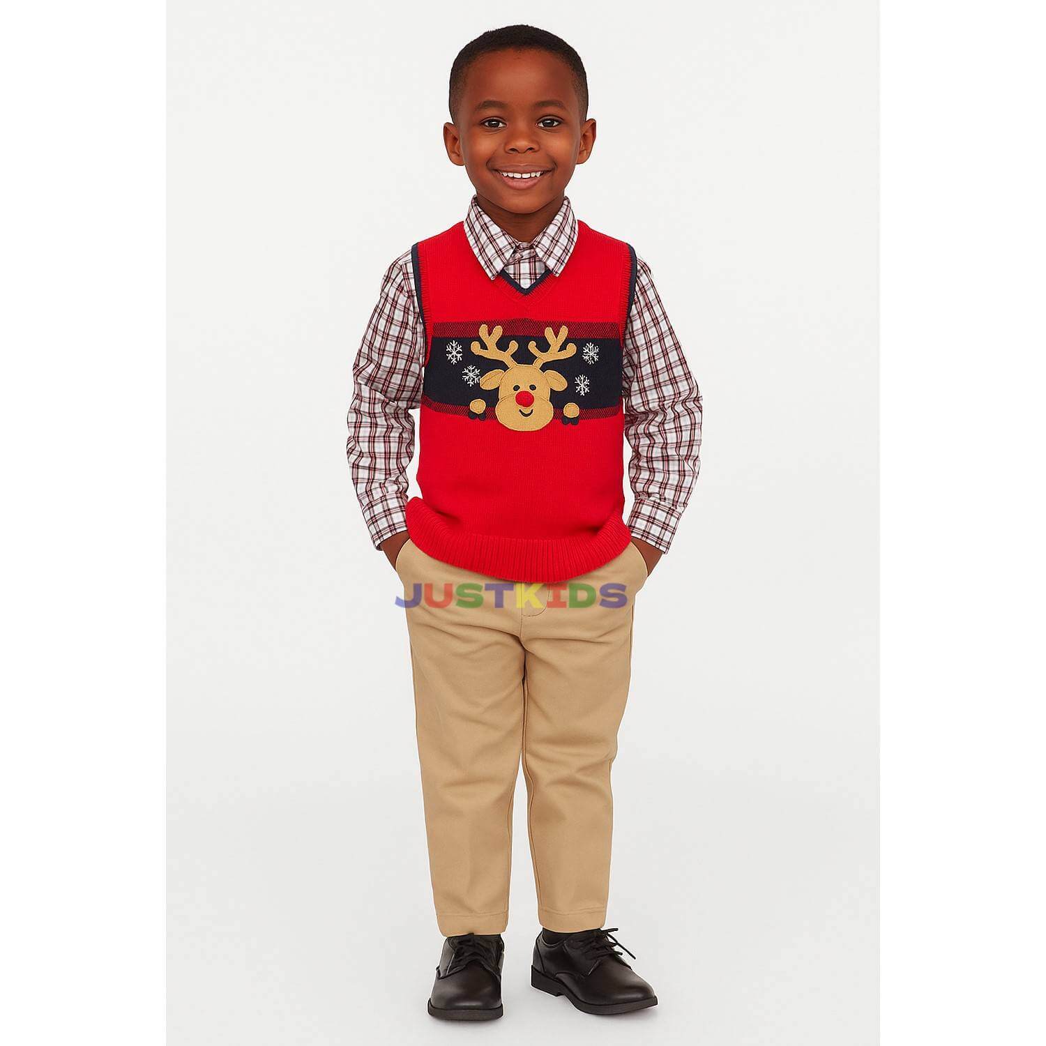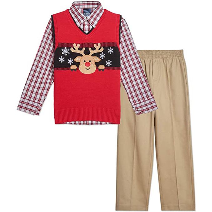 This three piece set is the perfect outfit for your boy’s Christmas outing and photo shoot. The set includes a vest, button down long sleeves plaid shirt and a pair of comfortable pants.